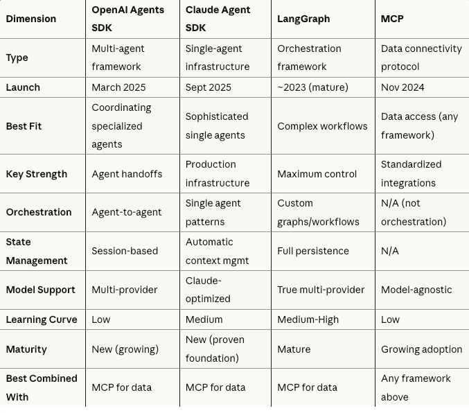 This article breaks down the major players: OpenAI Agents SDK, Claude Agent SDK, LangChain/LangGraph, plus the Model Context Protocol (MCP) for data connectivity, and provide a clear framework for choosing the right tools for your project.